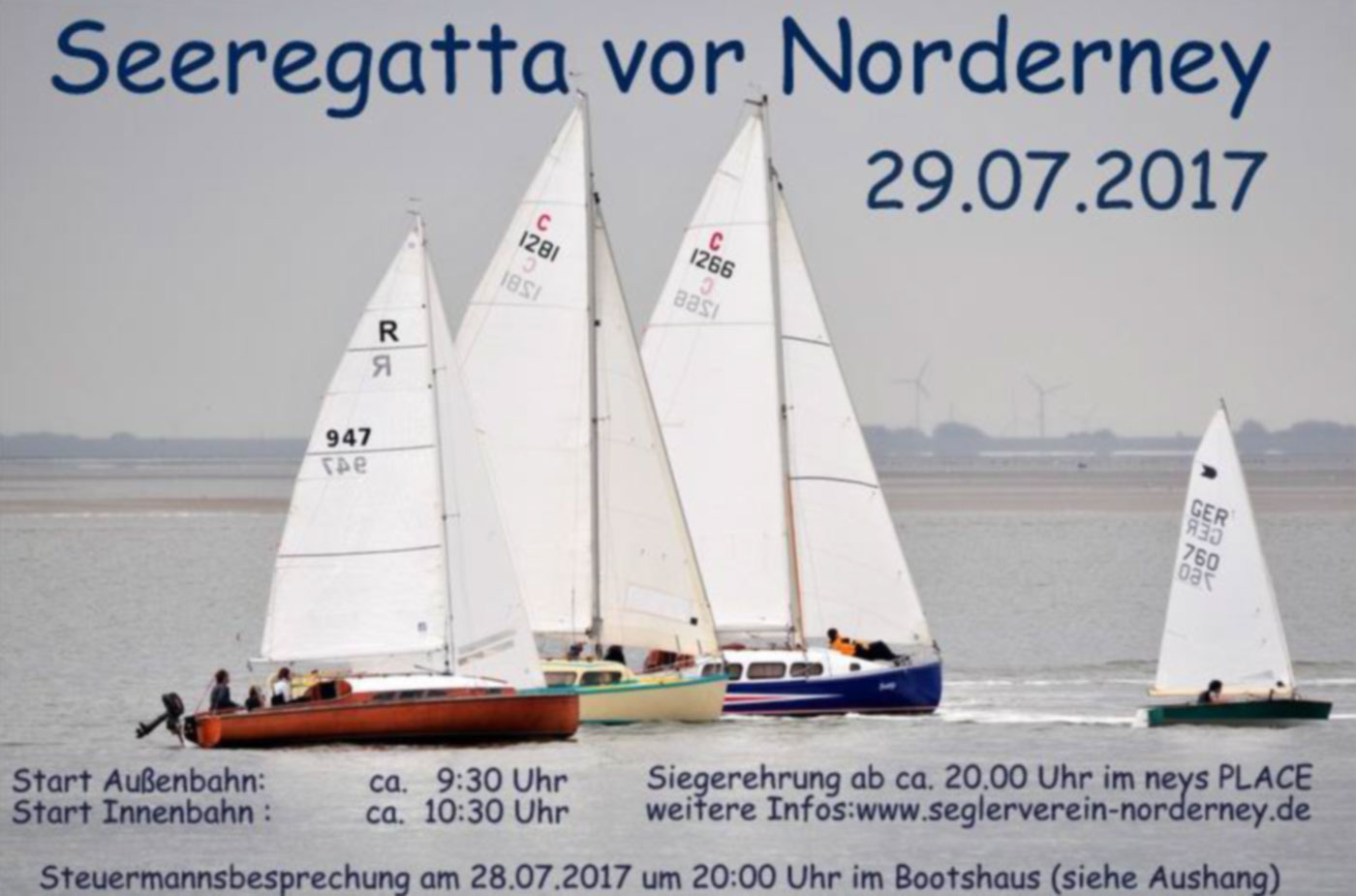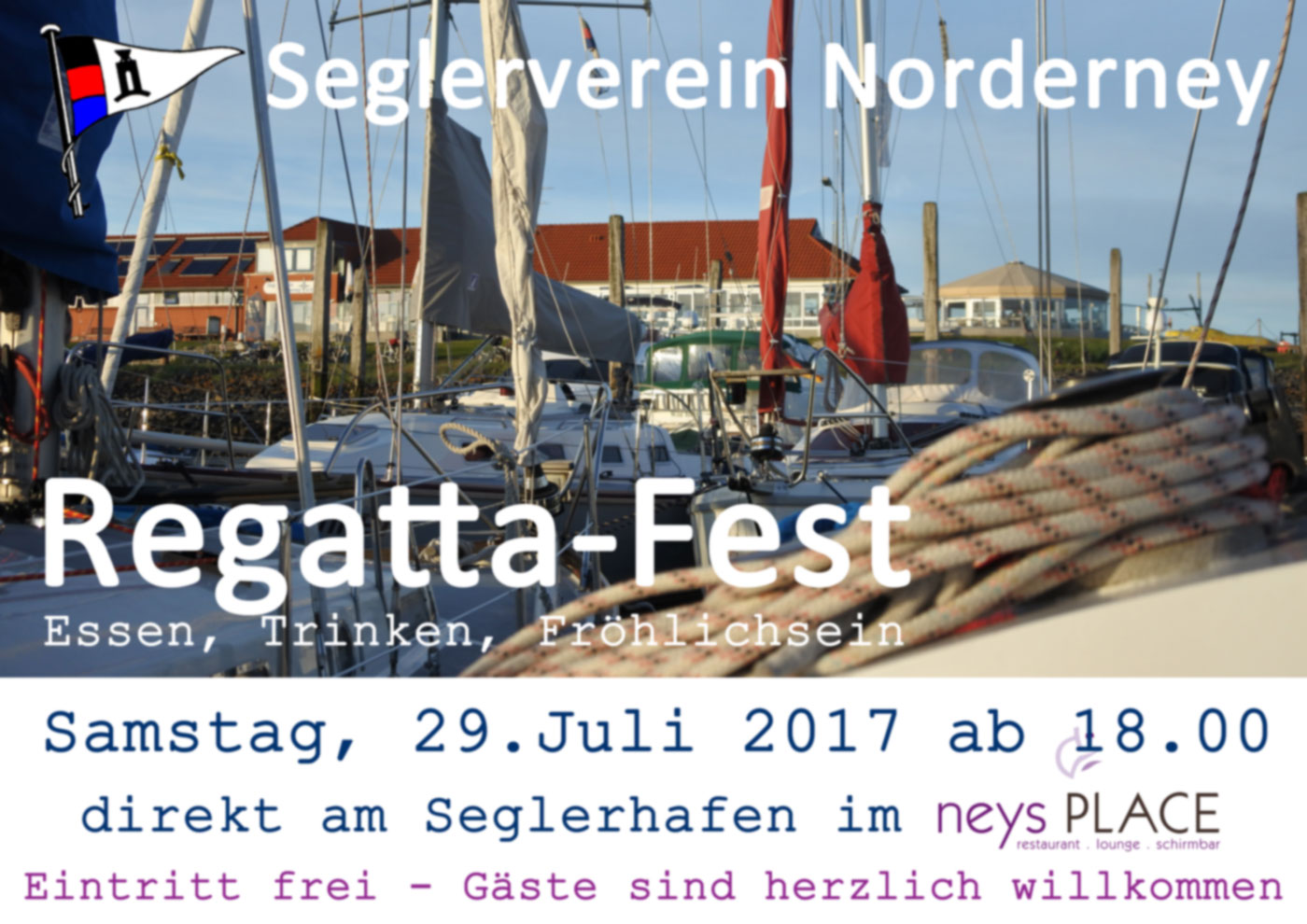 Wetterbedingt kam es bei unserer Seeregatta 2017 zur Startverzögerung. Bei kräftigem Wind am Morgen und besseren Wettervorhersagen für die Mittagszeit wurde erst ab 13.30 gestartet. Auf der Bahn im Inselwatt fanden sich letztlich sehr gute Segelbedingungen, die den Besatzungen Können und Kondition abforderten. 27 Schiffe hatten gemeldet – nicht alle starteten oder erreichten das Ziel – letztlich war es aber ein herrlicher Segeltag. Das anschließende Regattafest im NeysPlace hat allen Beteiligten viel Spaß gemacht.